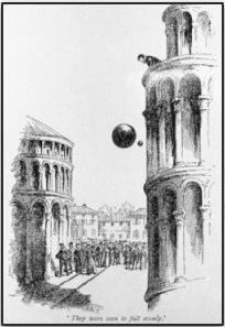 A la izquierda un esquema de los ensayos de Galielo Galilei en la torre de Pisa. A la derecha, una representación de Kepler y sus estudios orbitales.