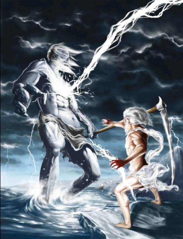 Una vez adulto Zeus se enfrentó a su padre, Cronos, obligándole a regurgitar la piedra y a sus cinco hermanos. Luego libera del Tártaro a los hermanos de su padre: los hecatónquiros y los cíclopes. Estos últimos en agradecimiento le regalan el rayo.