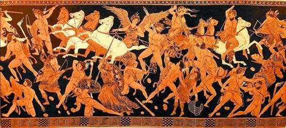 Una gran guerra llamada la Titanomaquía se desata. Zeus y sus hermanos y hermanas junto con los Hecatónquiros y Cíclopes, derrotaron a Cronos y a los restantes Titanes, que fueron encerrados en el Tártaro, en lo más profundo de la tierra.