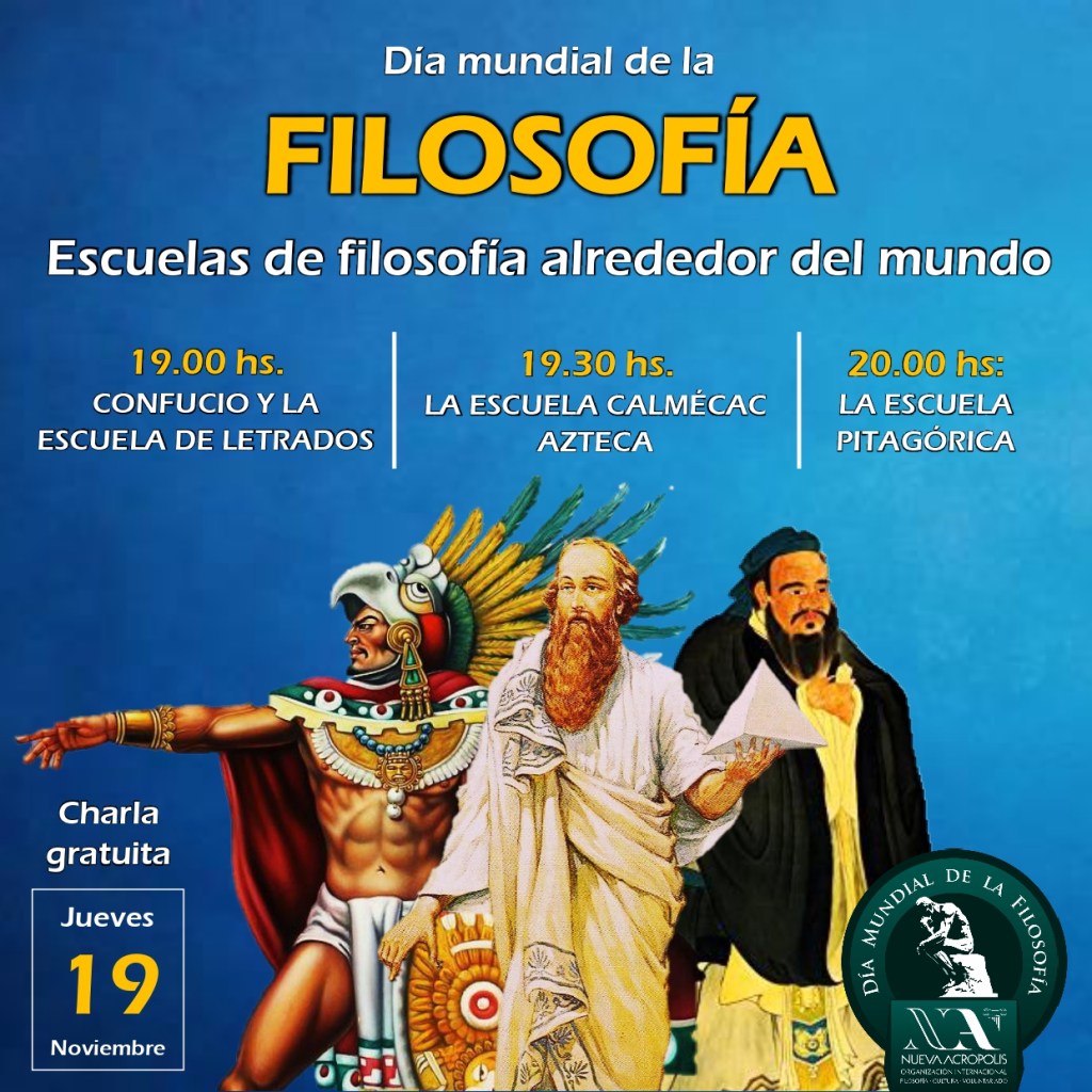 El tercer jueves de noviembre es declarado por la UNESCO como el DÍA MUNDIAL DE LA FILOSOFÍA. En esta oportunidad lo celebraremos con tres charlas dedicadas a escuelas filosóficas de Oriente, Occidente y América.
