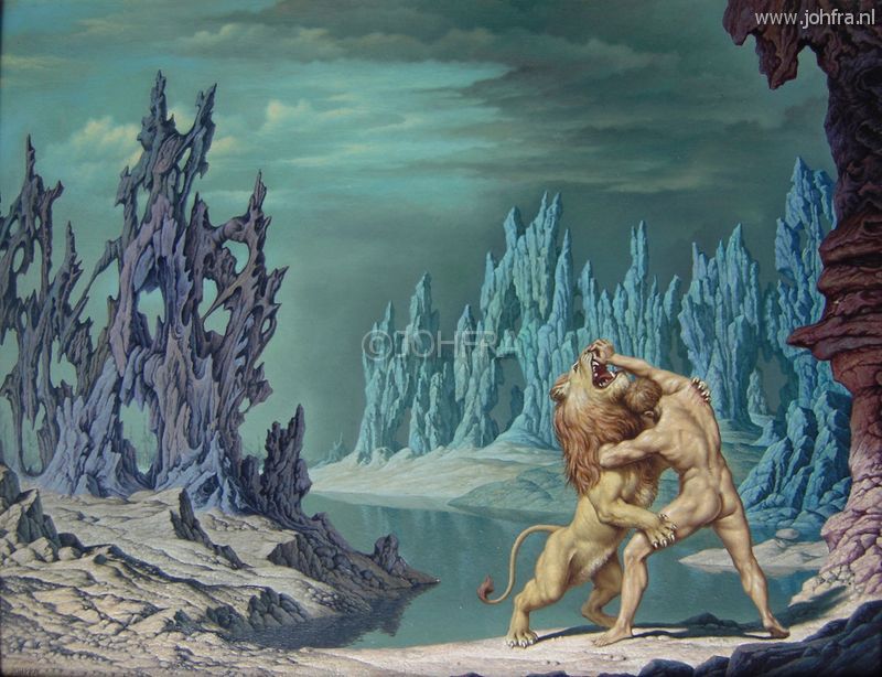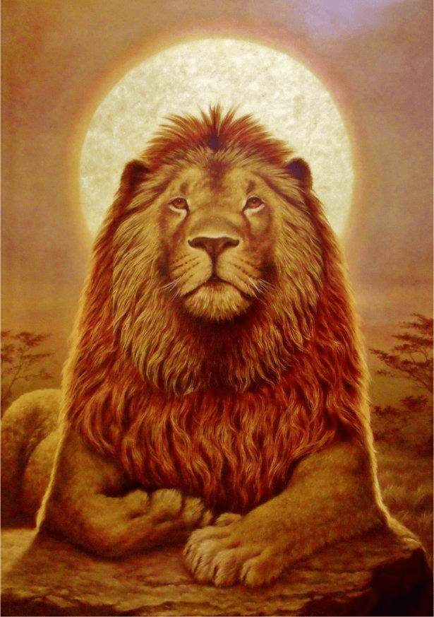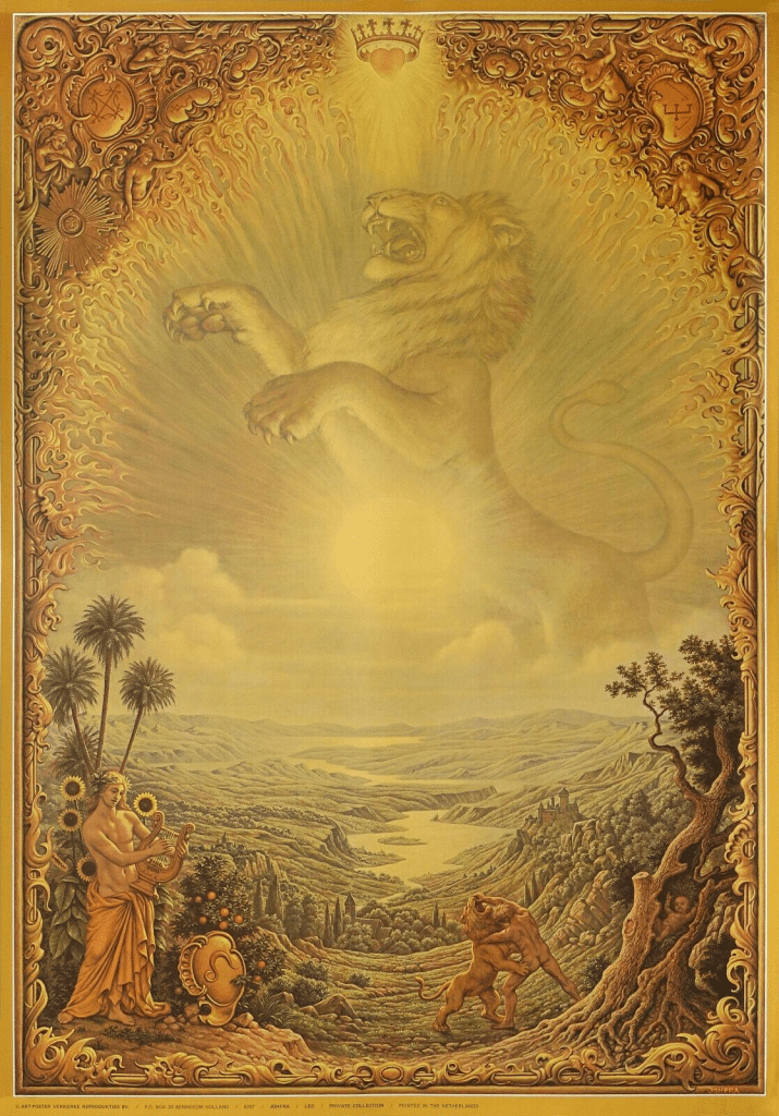 De igual manera, el nacido en Leo debe superarse a sí mismo para alcanzar su potencial. Por eso Johfra pintó un león en la tierra, en combate, y otro en el cielo, identificado con el Sol.