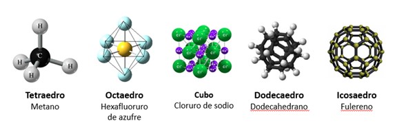 Según la teoría de los sólidos platónicos, estas moléculas se organizan en cinco formas geométricas fundamentales: tetraedro, hexaedro, octaedro, dodecaedro e icosaedro, que se asemejan a las estructuras moleculares descubiertas a finales del siglo XIX y principios del XX. Por ejemplo, la molécula de metano (CH4) tiene forma tetraédrica; el hexafluoruro de azufre (SF6) tiene estructura octaédrica; todos los metales alcalinos y algunos metales más, junto con el cloruro de sodio, tienen estructura cúbica, el hidrocarburo C20H20, muestra una estructura que se asemeja al dodecaedro y el fulereno estructura icosaédrica.
