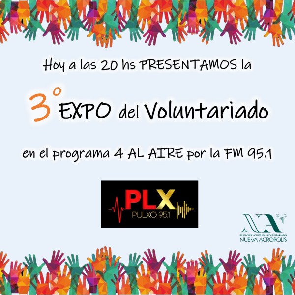 Estamos felices de contarles que esta noche a las 20 hs. estaremos presentando la Expo de Voluntariado en el programa 4 AL AIRE por PLX Pulxo 951. Las organizaciones que participarán en esta edición serán: Nueva Acrópolis Córdoba - Aventurate a la experiencia de la filosofía, Una Gota de Salud, Fundacion san vicente, Soles Ong, Meraki, Centro de Asistencia al Suicida. Córdoba,... Leer más →